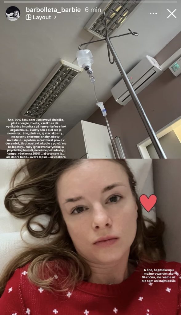 „A potom, a častokrát práve v decembri, život nastaví zrkadlo a položí ma na lopatky, roky ignorovania fyzickej a psychickej bolesti, nereálne požiadavky, tempo, všetko na 200%. Aj toto som ja, ale dobre bude, oveľa lepšie, už čoskoro,” napísala ku fotografii z nemocnice, na ktorej bola bez mejkapu. „A áno, bez mejkapu môžem vyzerať ako 16-ročná, ale reálne už nie som ani najmladšia,” dodala s humorom. Nič bližšie však o svojom zdravotnom stave nezverejnila. Barbore prajeme skoré uzdravenie.